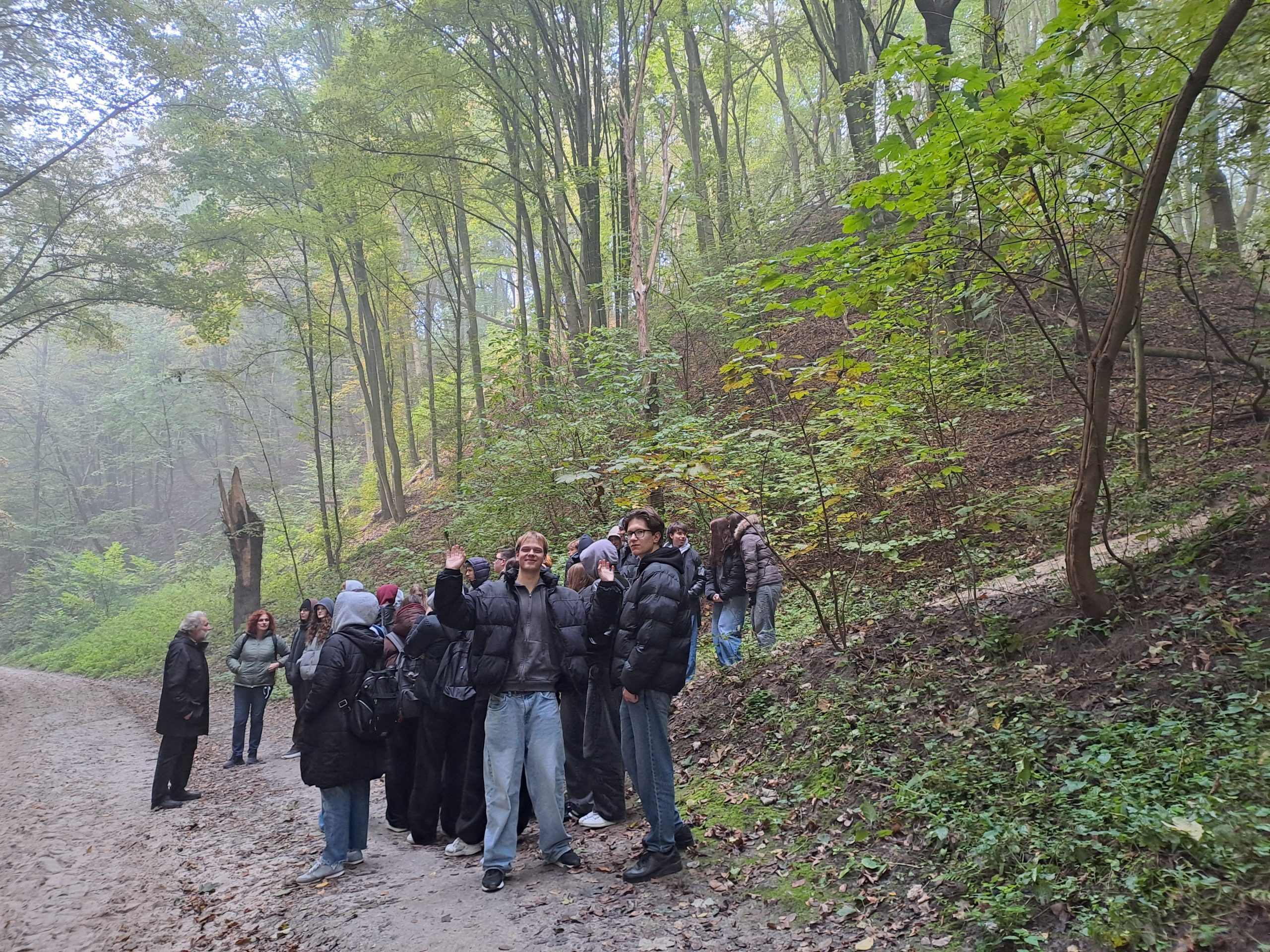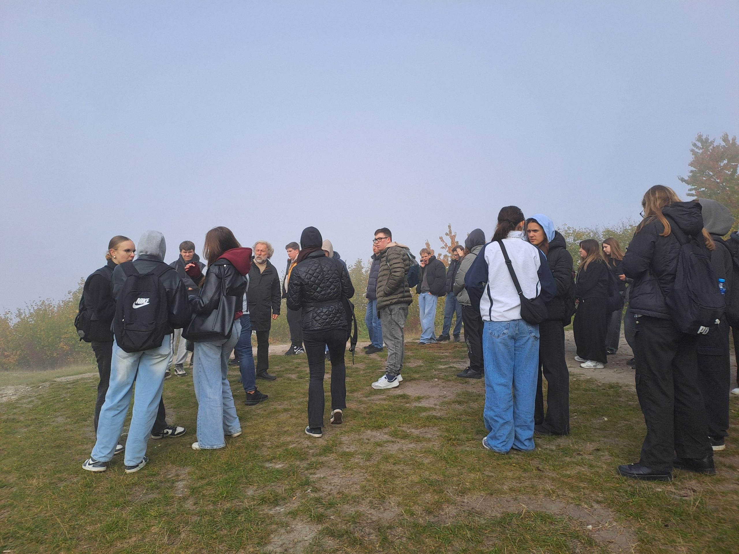 Pierwsza część dnia obejmowała terenowe zajęcia zaczynające się w malowniczym wąwozie Plebanka w Kazimierzu a kończące się przy promenadzie miasteczka wzdłuż biegu Wisły. Ważnym etapem był spacer po urokliwej letniskowej wsi Mięćmierz, utrzymanej w charakterze żywego skansenu dzięki wiekowym chałupom, często przeniesionym z innych obszarów Polski. Przy słonecznej pogodzie ze wzgórza Albrechtówka – wspaniałego punktu widokowego podziwiać można urzekającą panoramę na wieś, Małopolski Przełom Wisły oraz Równinę Radomską. To istotny obszar ze względu na pogranicze różnych, jakże innych krain geograficznych Polski. Niestety złośliwość pogody – długo utrzymująca się mgła ograniczyła widoczność na wyjątkowy krajobraz.