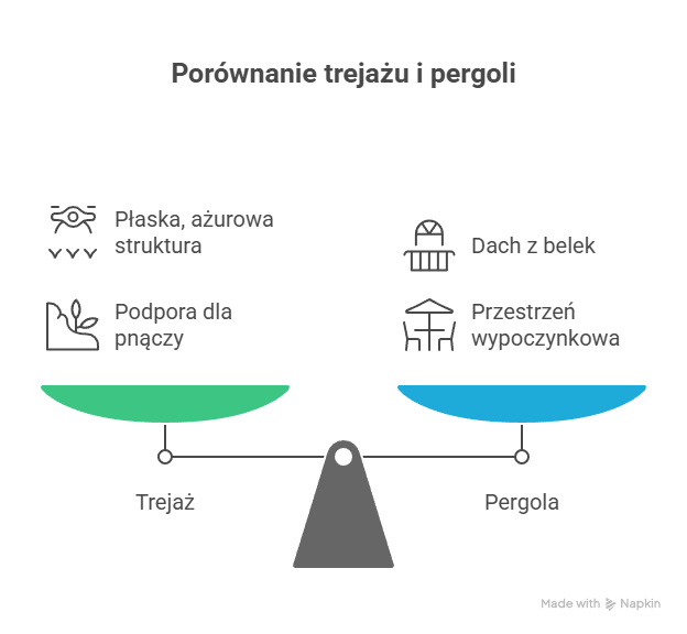 Trejaż to płaska, ażurowa konstrukcja bez dachu, służąca jako podpora dla pnączy. Pergola natomiast ma dach z belek i tworzy przestrzeń wypoczynkową.