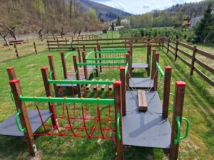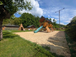 W tym samym czasie dorośli mogą odpocząć. Na terenie zagrody przygotowano leżaki, z których można korzystać, ciesząc się spokojem, zielenią i widokiem na beskidzką przyrodę. To miejsce, w którym nie trzeba się spieszyć – można po prostu usiąść i spędzić czas w swoim tempie.