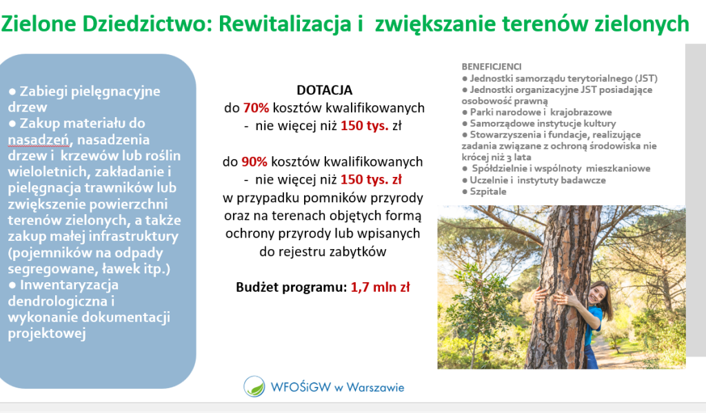 W WFOŚiGW w Warszawie troszczymy się o nie poprzez program „Zielone dziedzictwo”. Dzięki niemu samorządy i instytucje mogą pielęgnować pomniki przyrody, rewitalizować parki i zakładać nowe tereny zieleni. Dzięki dotacjom możliwe jest m.in.: