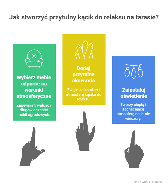 Na początek postaw na wybór mebli ogrodowych z technorattanu lub drewna, które są odporne na warunki atmosferyczne. Dywan zewnętrzny, miękkie poduszki i lampiony dodadzą przytulności, tworząc przytulny kącik do relaksu.
