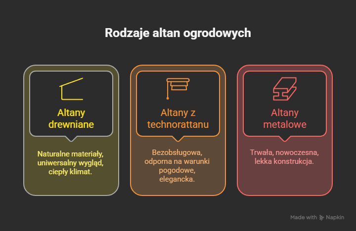 Altany ogrodowe drewniane | Naturalne materiały, uniwersalny wygląd, ciepły klimat | Wymaga konserwacji i regularnego malowania | Ogrody w stylu rustykalnym i klasycznym |