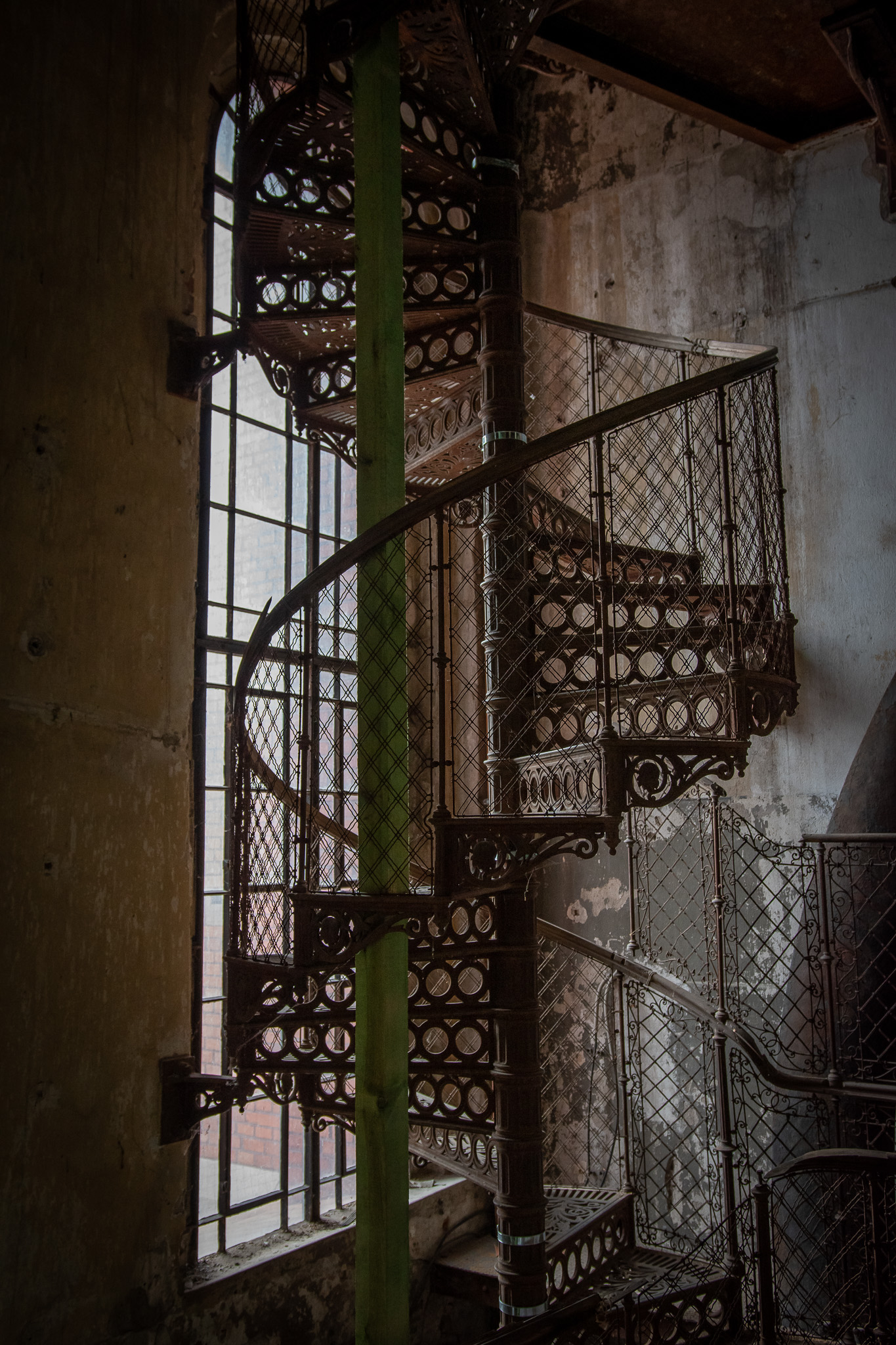Zabytkowe żeliwne schody w wieży ciśnień Na Grobli Lektorem podczas tej magicznej podróży jest Konrad Imiela, aktor, dyrektor artystyczny Teatru Muzycznego Capitol.