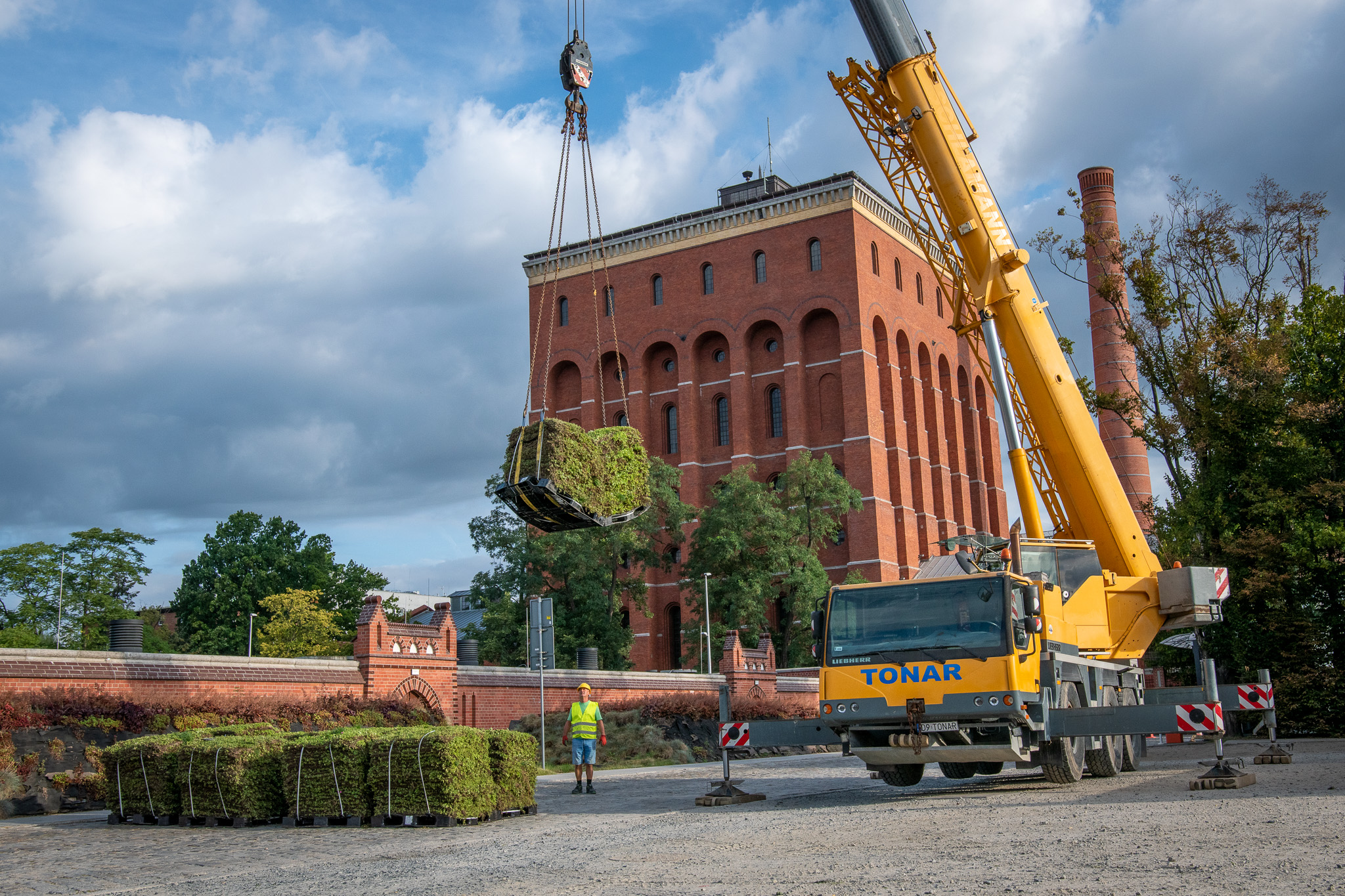 Przy montażu zielonego dachu pracował m.in. potężny dźwig Ważnym elementem tej przestrzeni są także rozety sensoryczne, ale i ławki. Co ciekawe, elementy małej architektury powstały z przetworzonych starych ubrań, tworząc unikatowy kompozyt tekstylny. – Na dachu ustawiliśmy lunetę, która pozwala podziwiać zabytkową architekturę, a także… wypatrywać krasnala Pompeusza, który zadomowił się w jednym z okien wieży ciśnień Ubrany w ogrodniczki z logo spółki, trzyma w dłoni szklankę wody wykonaną z kryształu w Hucie Szkła „Julia” w Piechowicach – mówi Karolina Michalak-Żmuda, z MPWiK.