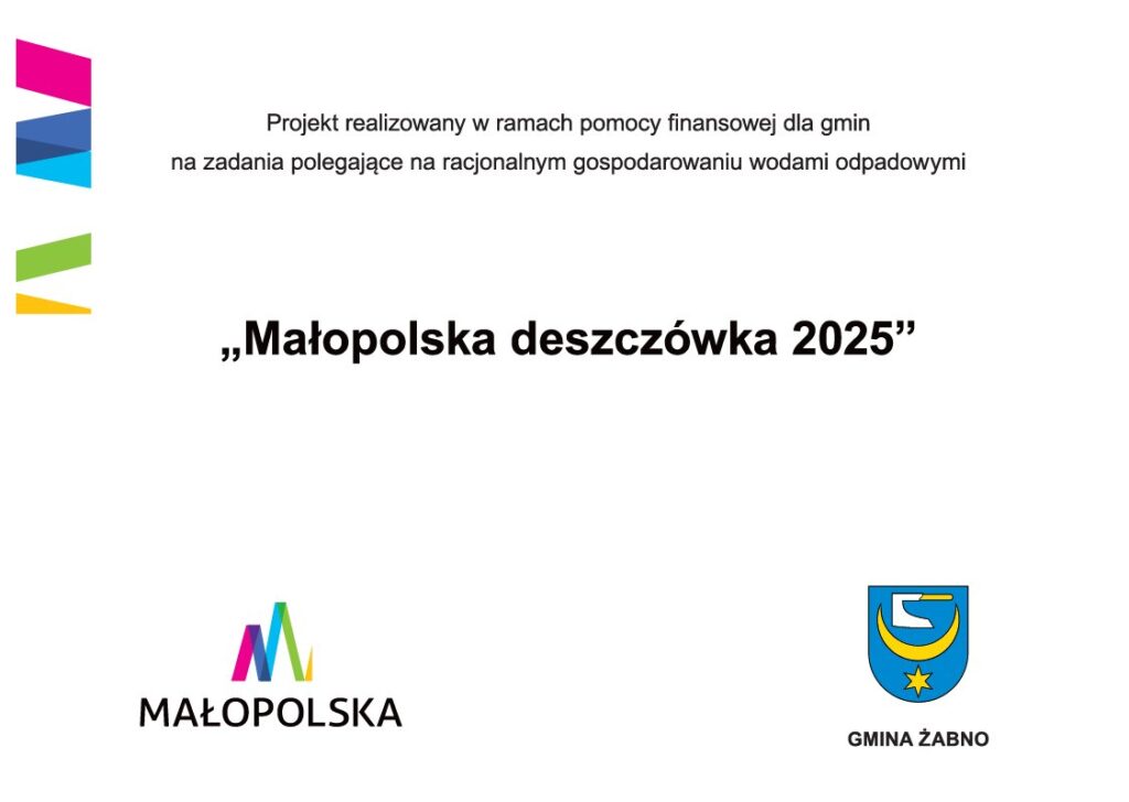 Gmina Żabno zakończyła realizację projektu pn. „Małopolska Deszczówka 2025” w ramach zadania pn. „Zaopatrzenie mieszkańców Gminy Żabno w zbiorniki na deszczówkę”.