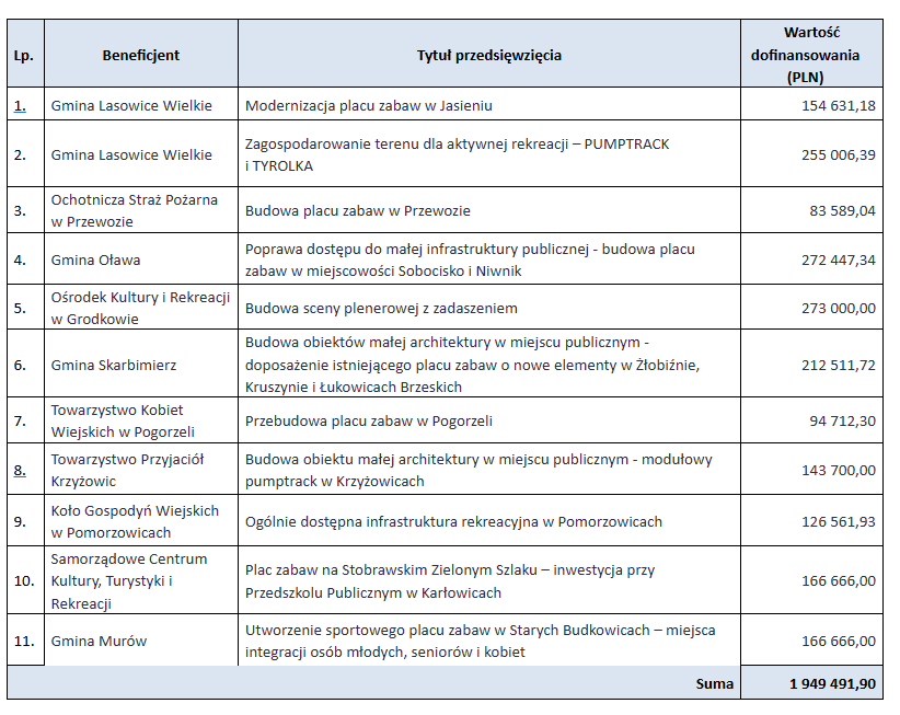 Ciekawostką tegorocznej edycji jest udział gminy spoza regionu. – Choć jesteśmy z województwa dolnośląskiego, korzystamy z opolskich środków dzięki współpracy w ramach Brzesko-Oławskiej Wsi Historycznej. Historycznie to jeden spójny obszar, podział administracyjny był wtórny. Dzięki dofinansowaniu powstaną dwa place zabaw – w Sobocisku i Niwniku, w sąsiedztwie nowego przedszkola – wyjaśniała Helena Masło, zastępczyni wójta Oławy.