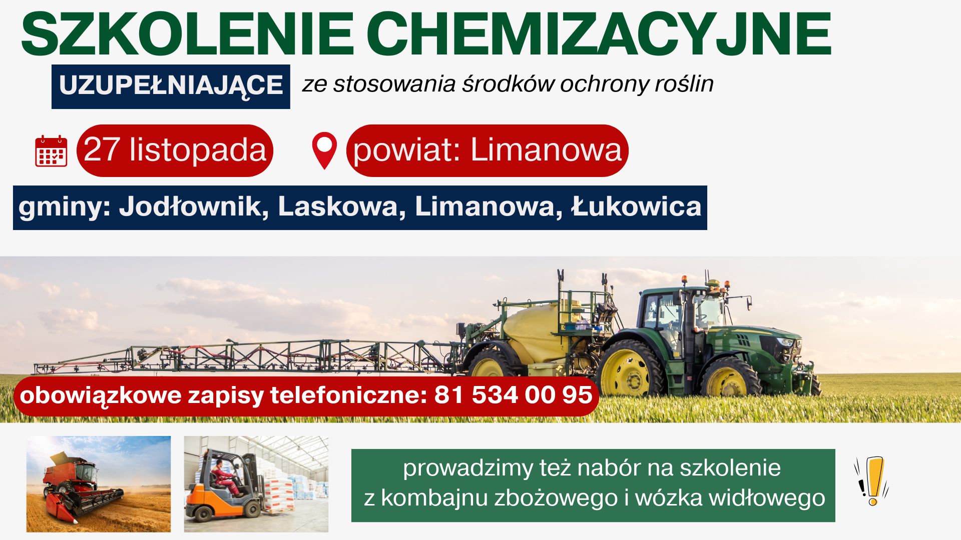 27 października 2025 r. odbędą się szkolenia chemizacyjne uzupełniające skierowane do mieszkańców powiatu limanowskiego, którzy stosują środki ochrony roślin.