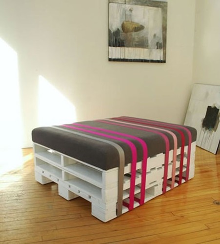 Bardzo proste w wykonaniu są również wszelkie sofy czy pufy z palet euro. Wystarczy odpowiednio wykończyć drewno i uzupełnić całość poduszkami. jeżeli potrzebujemy wyższych mebli z palet, wystarczy jedynie zbić dwie palety razem.