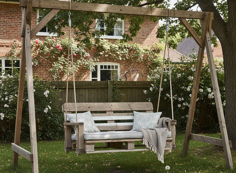 Huśtawka | Cała paleta lub dwie | Wkrętarka, lina | Poduszki, ozdoby | Rozrywka dla dzieci i dorosłych |