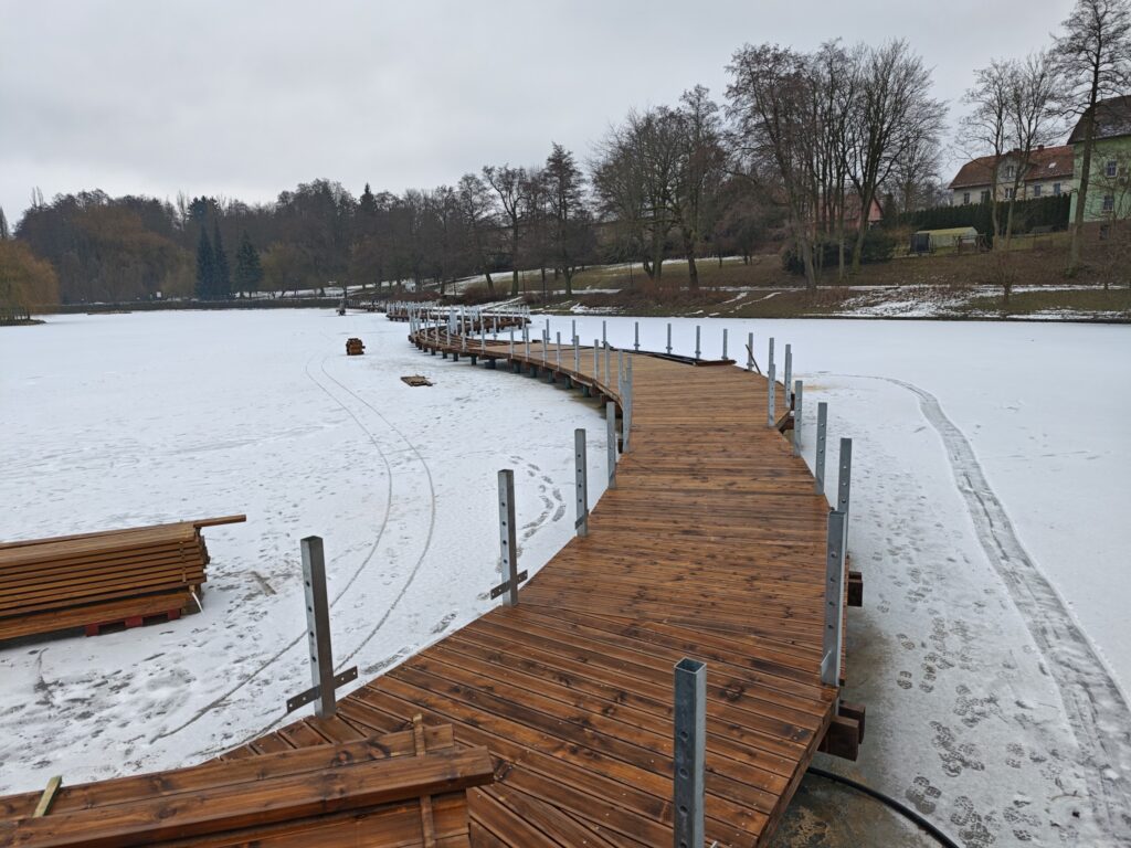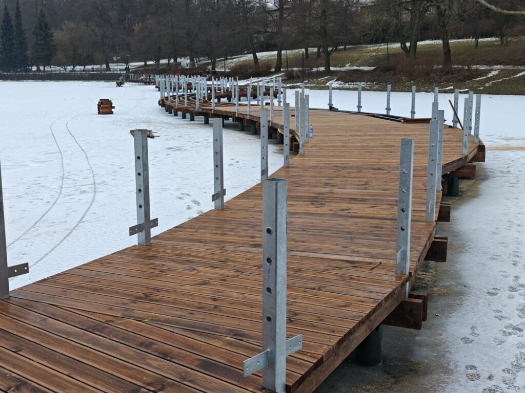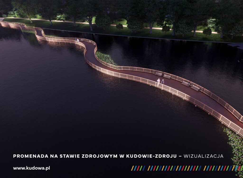 Umowę na realizację inwestycji podpisano w maju 2025 roku. Projekt zakłada powstanie nowoczesnej i funkcjonalnej przestrzeni rekreacyjnej. Kładka będzie miała 180 metrów długości oraz 2,5 metra szerokości, co umożliwi wygodne i malownicze przejście przez środek Stawu Zdrojowego. Wybudowana zostanie także zapewniająca bezpieczeństwo użytkownikom, ażurowa balustrada, a całość zostanie oświetlona, dzięki czemu z obiektu będzie można korzystać również po zmroku. Na trasie powstaną trzy strefy rekreacyjne z ławeczkami, a wzdłuż kładki – wodne ogrody liliowe.
