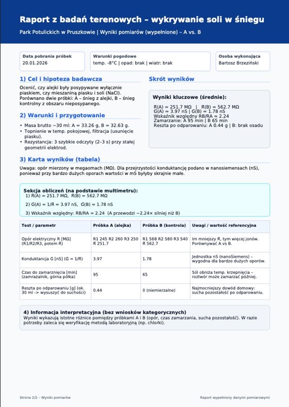 Już następnego dnia późnym wieczorem przesłał do redakcji raport ze swoich badań. W jego ocenie w pobranych próbkach z terenu parku znajdowała się substancja przypominająca sól. Jak podkreśla, wykonał proste testy, do których wystarcza znajomość fizyki i chemii na poziomie szkoły średniej.