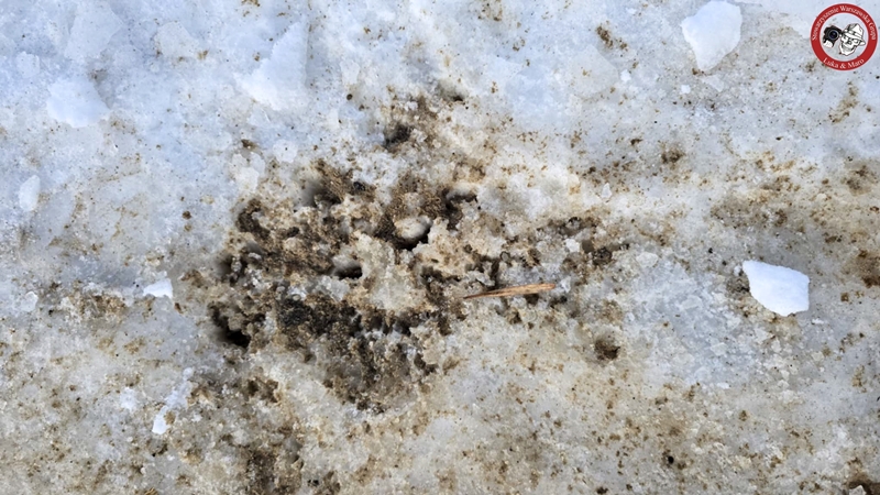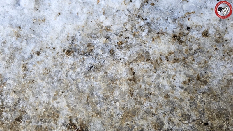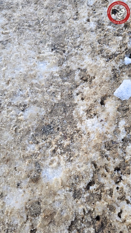 Jeśli się zatrzymać i popatrzyć, ewidentnie w śniegu i lodzie można zauważyć wżery po soli. Po rozbiciu, czy rozkopaniu większych grudek piachu natrafiamy na większe lub mniejsze kawałki soli.
