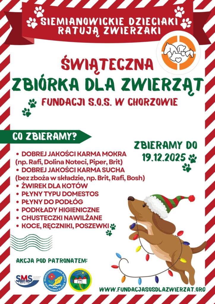 Jak co roku, Stowarzyszenie Mieszkańców Siemianowic SMS wraz z Przedszkolem nr 20 Zielona Kraina w Siemianowicach Śląskich, tym razem przy udziale Młodzieżowej Rady Miasta Siemianowice Śląskie, zbiera dary dla Fundacji S.O.S. dla Zwierząt!