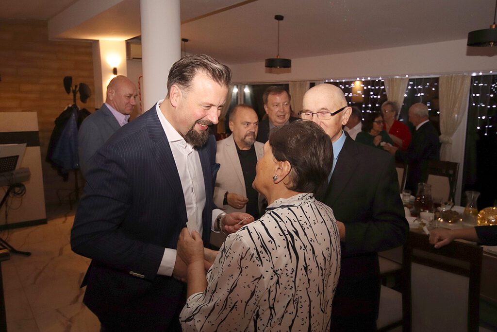 Prezydent Rafał Piech składa bożonarodzeniowe życzenia gościom podczas spotkania opłatkowego.