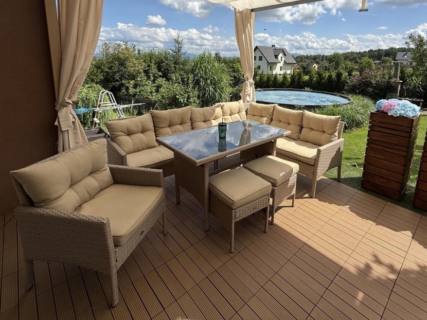 | Strefa do spotkań towarzyskich | Idealne rozwiązanie to zestawy ogrodowe umożliwiające swobodne rozmowy, elastyczne w konfiguracji i sprzyjające nieformalnej atmosferze, modułowe zestawy wypoczynkowe (narożniki ogrodowe, sofy, fotele, pufy) z niskimi stolikami. Warto wybrać modele z miękkimi poduszkami. | – kominek zewnętrzny (na chłodniejsze wieczory), – nastrojowe oświetlenie (girlandy świetlne), – bar zewnętrzny lub wózek na napoje, – system nagłośnieniowy. |