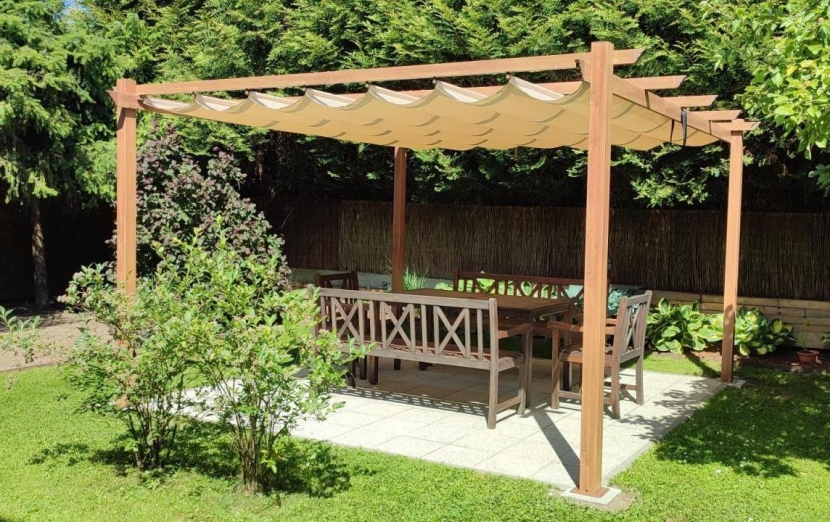 - pergola – to popularna konstrukcja wykonana z drewna, metalu lub aluminium, łatwa do samodzielnego montażu. Może być minimalistyczna (płaski dach i podpory) lub mocniej zabudowana (boczne ścianki, w tym pergole przesuwne lub ruchome lamele i żaluzje do kontrolowania ilości światła).