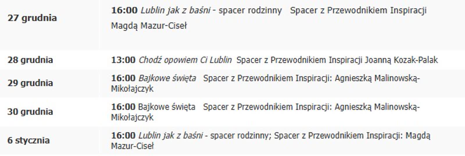 Jak wspomnieliśmy, można pospacerować po Roztoczu, a można się wybrać na spacer po Lublinie z przewodnikiem. Miasto, na ten czas świąteczno-noworoczny, przygotowało kilka tematycznych spacerów, na który można się wybrać z całą rodziną. Więcej informacji o spacerach – TUTAJ.