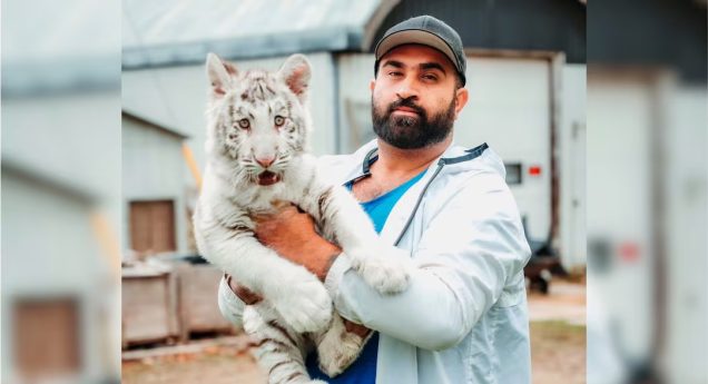 Masood z młodym tygrysem, którego trzymał na swojej posesji. Tygrys i hiena zostały zatrzymane przez ontaryjskiego inspektora ds. dobrostanu zwierząt.