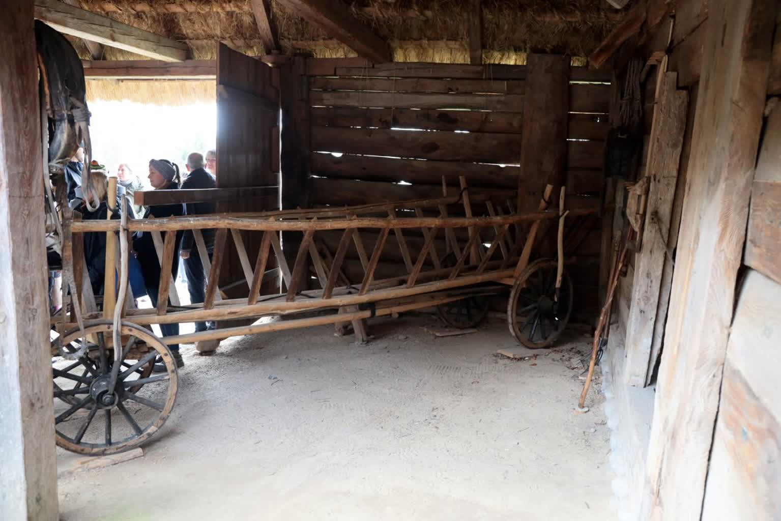 – Budynek z XIX wieku pozyskaliśmy w 1977 roku. Należał do rodziny Borówków – mówi Sylwia Paćkowska kurator ekspozycji. – Okólnik jest takim budynkiem, gdzie mamy pod jednym dachem pomieszczenia, w których przechowywane były różne sprzęty rolnicze i trzymane były zwierzęta. Więc sam okólnik składa się z takich pomieszczeń, jak poddach, mamy też stajnię, chlew, oborę, stodołę oraz pomieszczenie, wnęka gdzie przetrzymywano różne sprzęty. Tutaj mamy np. brony, pług, płużek, sprężynówkę. I jeszcze był kurnik, obora dla cieląt i skład z piwnicą.